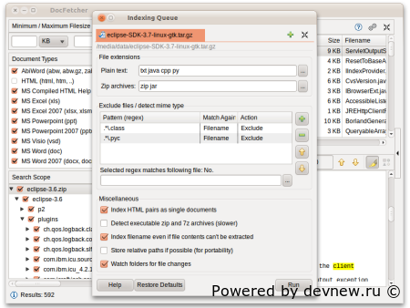 Обновления индекса: Конечно, индекс отображает файлы в их состоянии на момент индексирования. А оно могло и измениться. То есть, если индекс не актуален, результаты поиска будут устаревшими. Точно так же устаревает телефонная книга. Но это не проблема. Как мы уже знаем, большинство файлов обновляется очень редко. Кроме того, DocFetcher может автоматически обновлять индексы: (1) При запуске он определяет изменённые файлы и, соответственно, обновляет их индексы. (2) Когда он не запущен, маленький фоновый процесс будет определять изменения в файлах и составлять список тех из них, которые требуют обновления индекса. DocFetcher обновит эти индексы при следующем запуске.